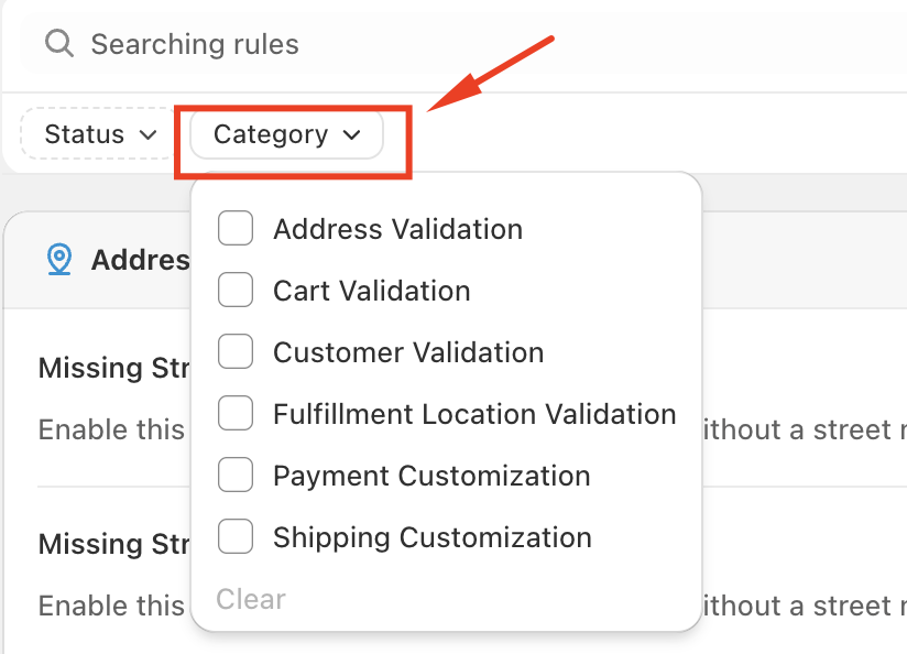You can use Category and Status filters together to further refine your results. For example, you may choose to view only Published Address Validation rules to quickly audit active address restrictions.