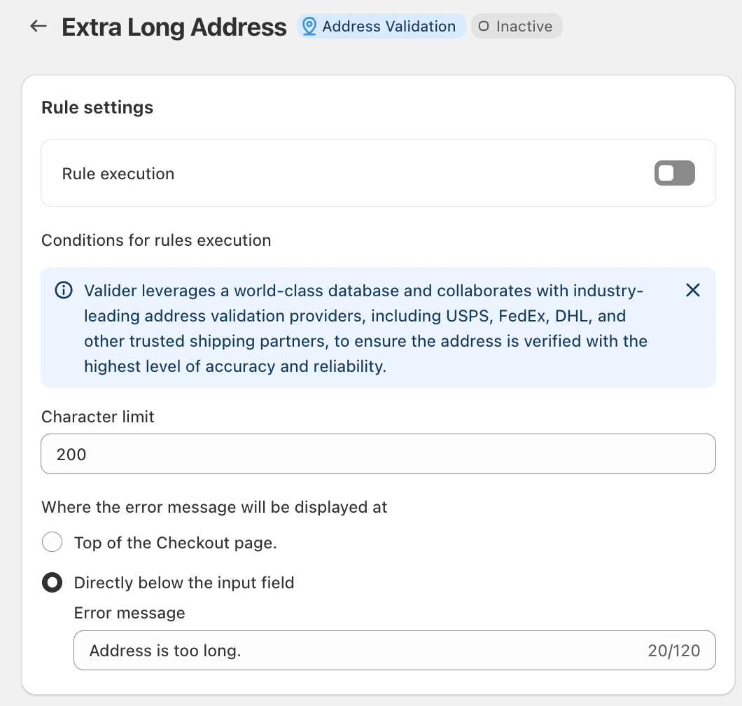 The Extra Long Address rule helps maintain clean, compatible address data by preventing excessively long entries at checkout. By setting a reasonable character limit, Valider ensures that shipping addresses meet carrier requirements and are processed accurately.