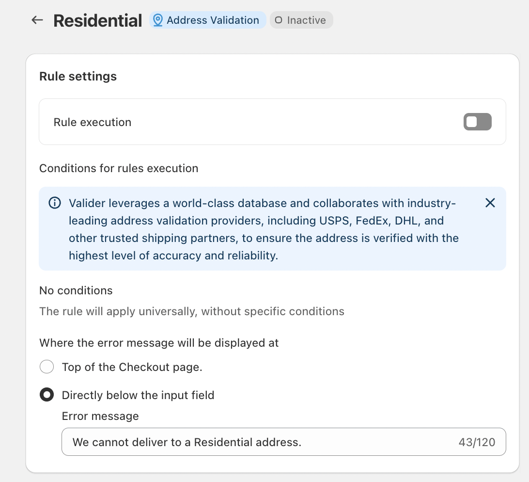 The rule applies universally, without the need for additional conditions. Once activated, every checkout address is automatically validated for residential status.