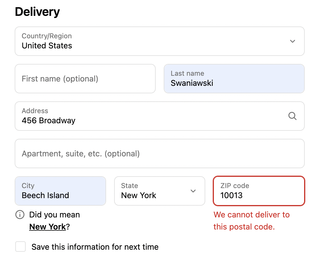 If the customer enters a ZIP or postal code that matches any restricted entry, checkout is immediately halted. An error message is shown, prompting the customer to update their address before continuing.