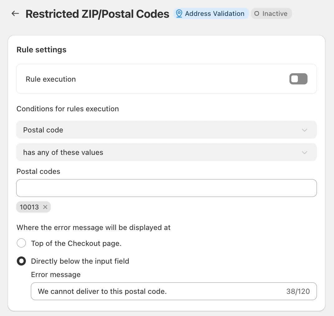 The rule can be turned on or off at any time, making it easy to adapt to changing shipping zones, carrier coverage updates, or temporary delivery restrictions.