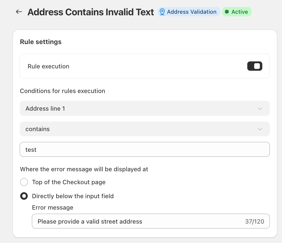 When enabled, the Address Contains Invalid Text rule checks the content of the address field—such as Address Line 1—during checkout.
