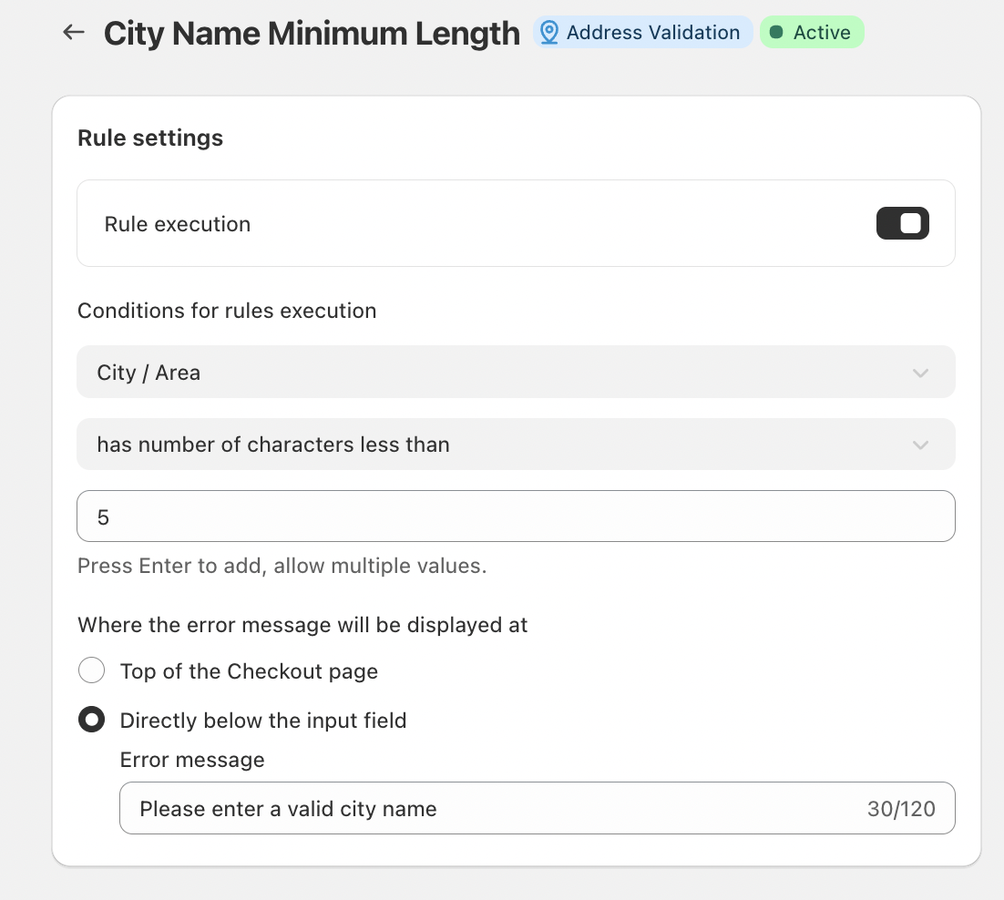 Merchants can define the minimum number of characters required for a city name. This ensures that entries meet basic validity standards without being overly restrictive.