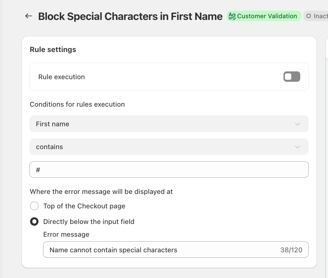 Once enabled, the Block Special Characters in First Name rule automatically applies to all checkouts, ensuring that no first name with special characters is allowed without requiring any additional setup or complex configuration.