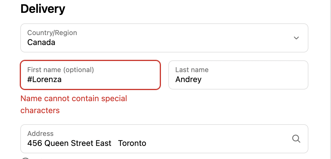 When a special character is detected in the first name field, an error message will appear directly top of the Checkout page or below the input field. This immediate feedback allows customers to easily identify and correct their mistake, streamlining the checkout process and reducing frustration.