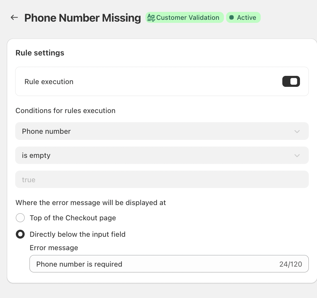 Once enabled, the Phone Number Missing rule runs automatically during checkout. It continuously checks whether the phone number field is empty and applies to all customers without the need for additional conditions.