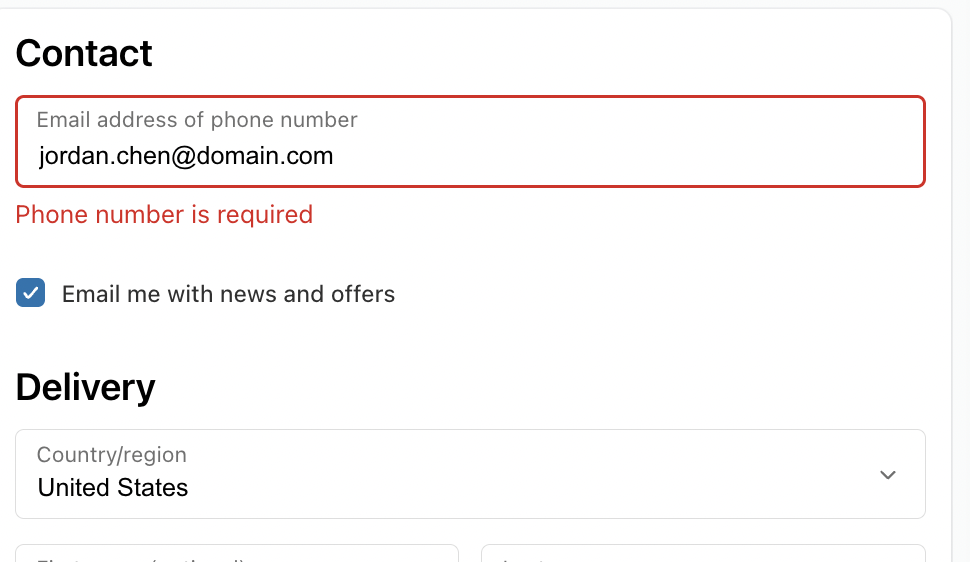 If a phone number is missing, an error message can be displayed either at the top of the Checkout page or directly below the phone number input field. This immediate feedback helps customers quickly understand what information is required.