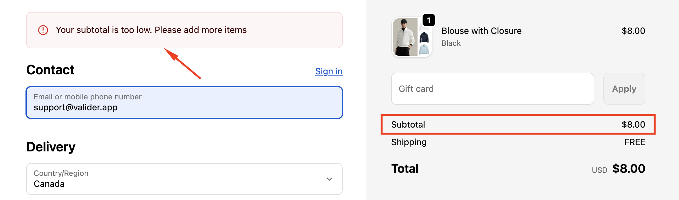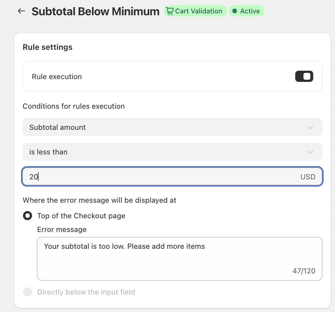 The Subtotal Below Minimum rule functions by validating the cart total during checkout. The rule is set to trigger an error message when the subtotal is lower than the required amount. For example, if your rule specifies that the subtotal must exceed $20 USD, the system will check the cart total during checkout. If the subtotal is less than $20, the system will prompt the customer with an error message.