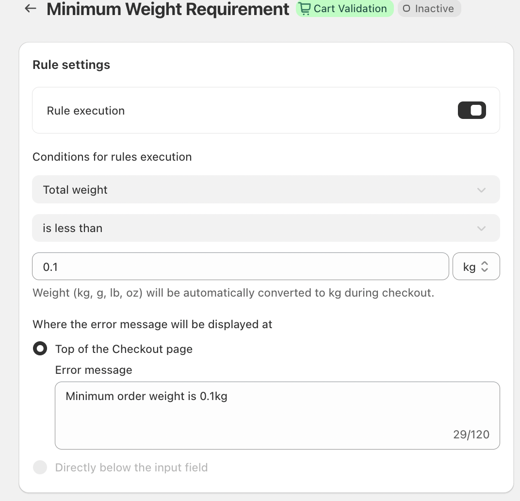Once the Minimum Weight Requirement rule is enabled, it automatically executes during checkout without the need for manual intervention. This ensures consistency and accuracy in cart validation.