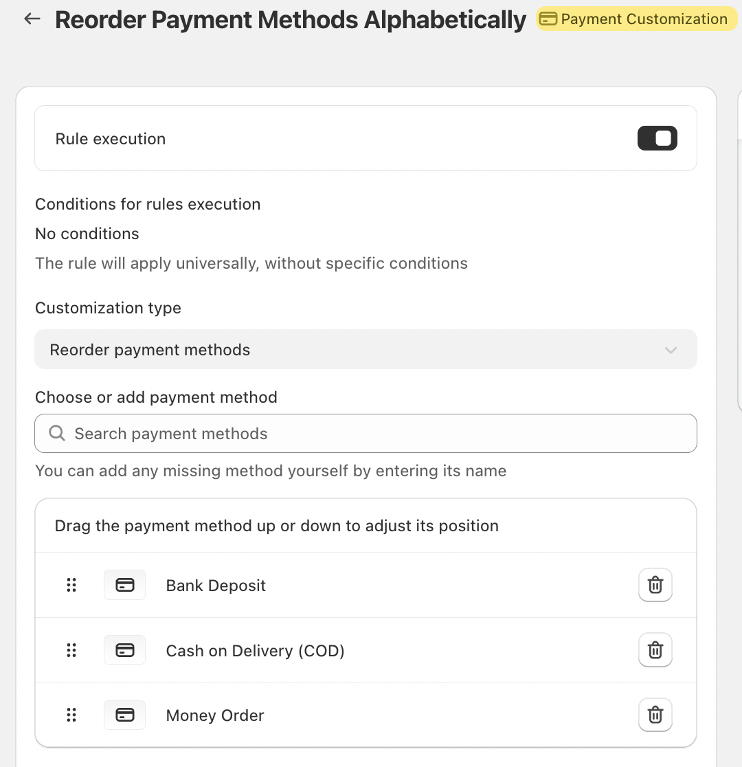 Enable the Rule: This rule applies universally without needing any specific conditions. Once enabled, it will automatically reorder all your payment methods alphabetically every time the customer reaches the checkout page.