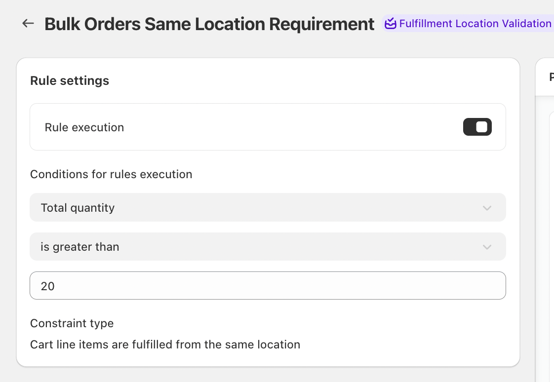 Customizable Rule Threshold: The Bulk Orders Same Location Requirement rule allows you to set a specific quantity threshold that triggers the rule. For example, if the total order quantity exceeds 20 items, the system will enforce the rule to ship from the same location.
