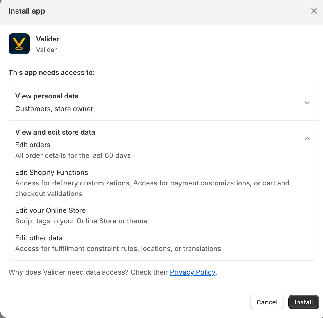 Rest assured, VL is firmly committed to safeguarding your privacy in accordance with our Privacy Policy and Terms of Service. All Shopify data we access is used strictly for application purposes only, and your private information remains secure and protected at all times.