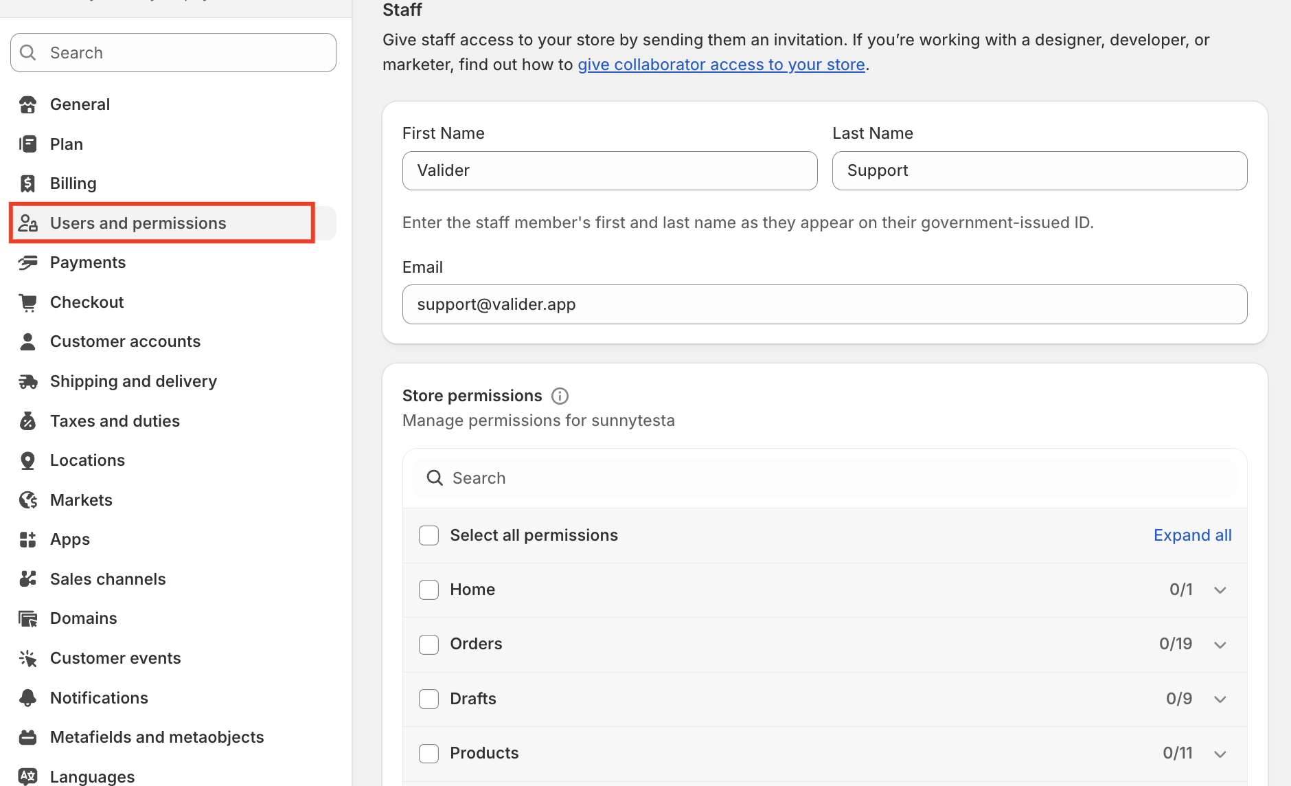 Enter a first name (Valider), a last name (Support), an email address ( support@valider.app) for the new staff member, then send the invitation to us and let us know via the email.