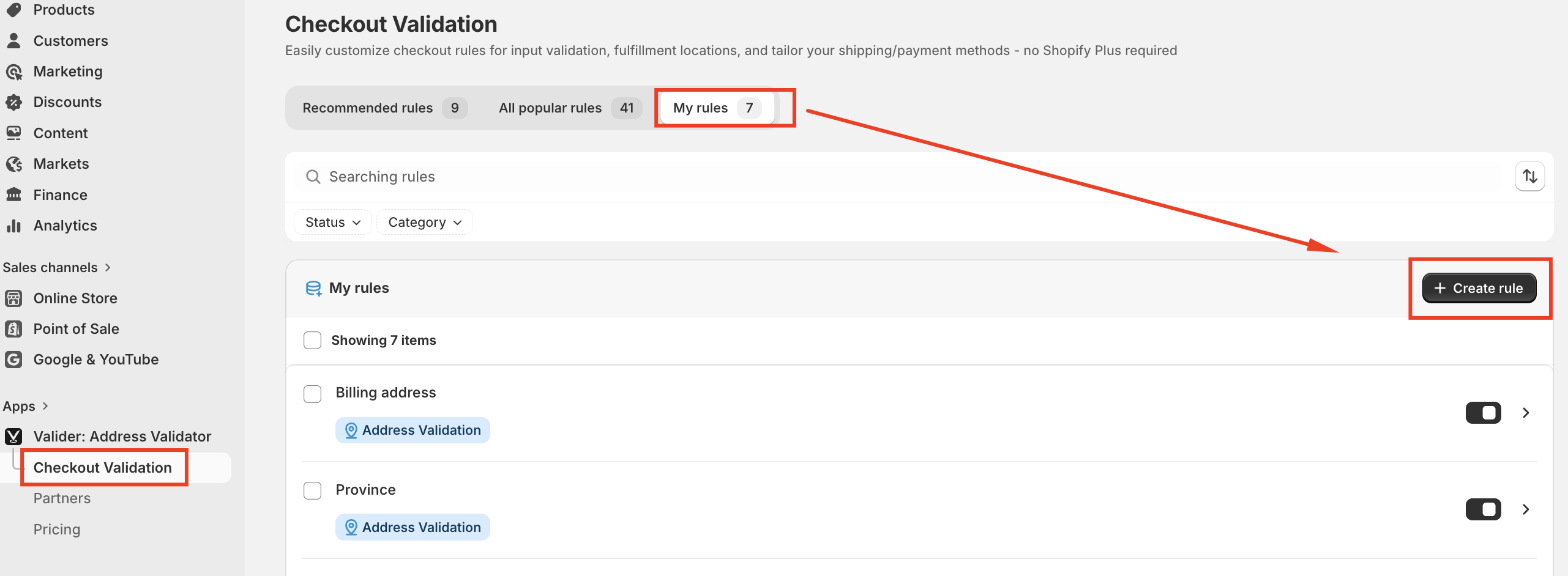 Click on Create Rule to start setting up a new rule for validating the billing address during the payment stage.