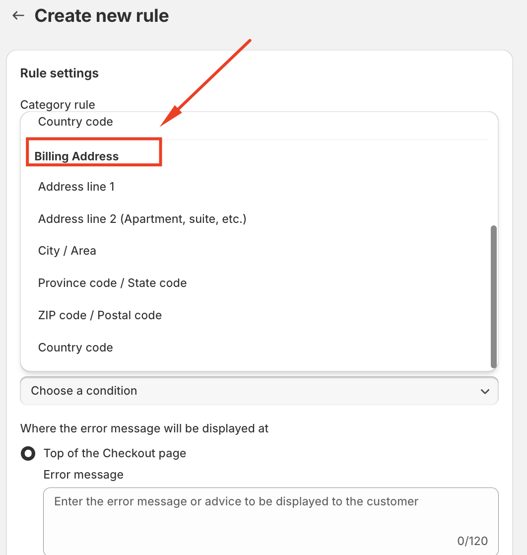 Choose Billing Address as the category for your rule. This will allow you to target fields such as Address Line 1, Address Line 2, City, ZIP/Postal Code, Country, and Province/State.