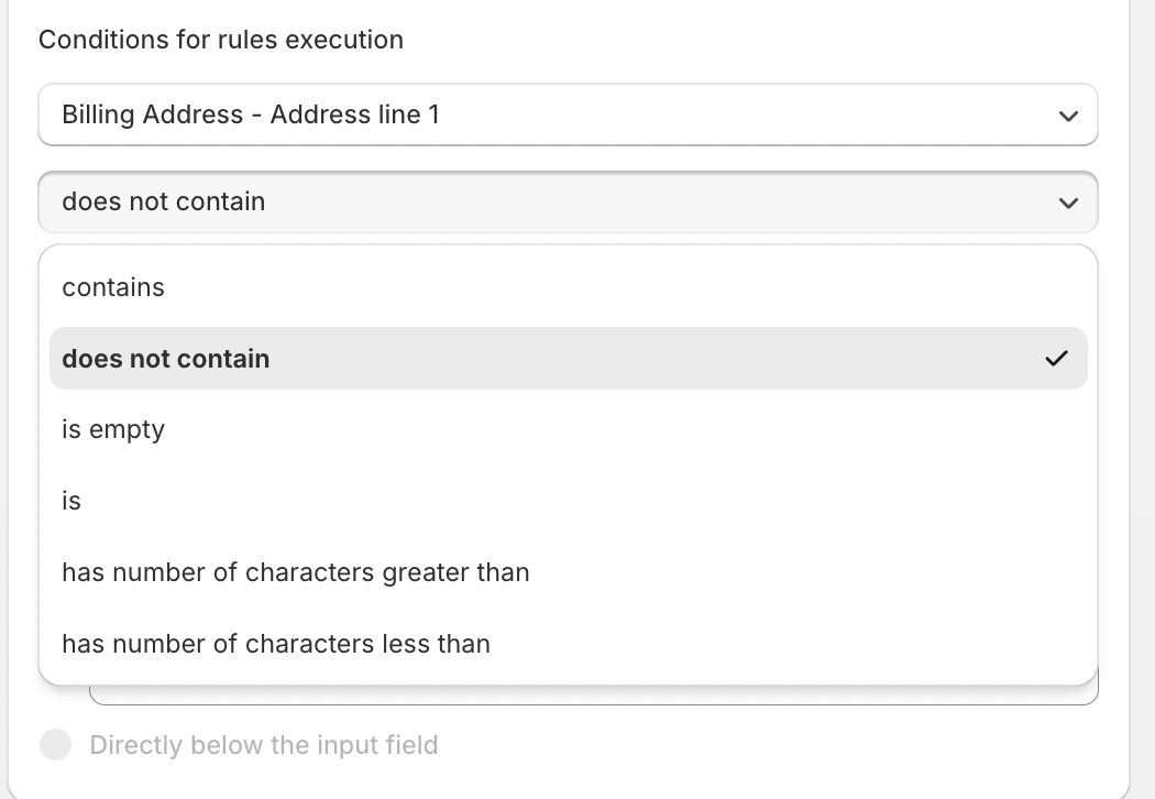 After selecting the Billing Address category, you can define specific conditions under which the rule will trigger. These conditions ensure that the billing information entered by the customer is correct and matches the payment provider’s records.